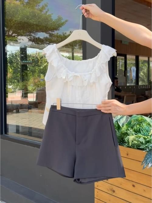 下装高腰阔腿短裤版型,顺直垂感强,遮胯遮腿型,显腿长显比例。